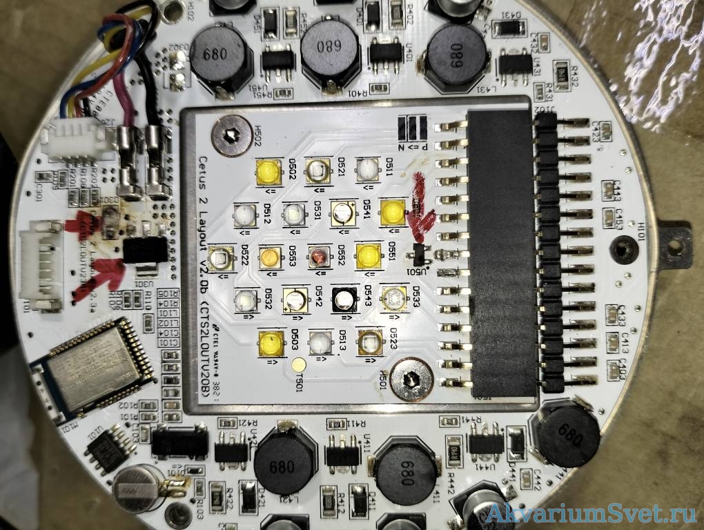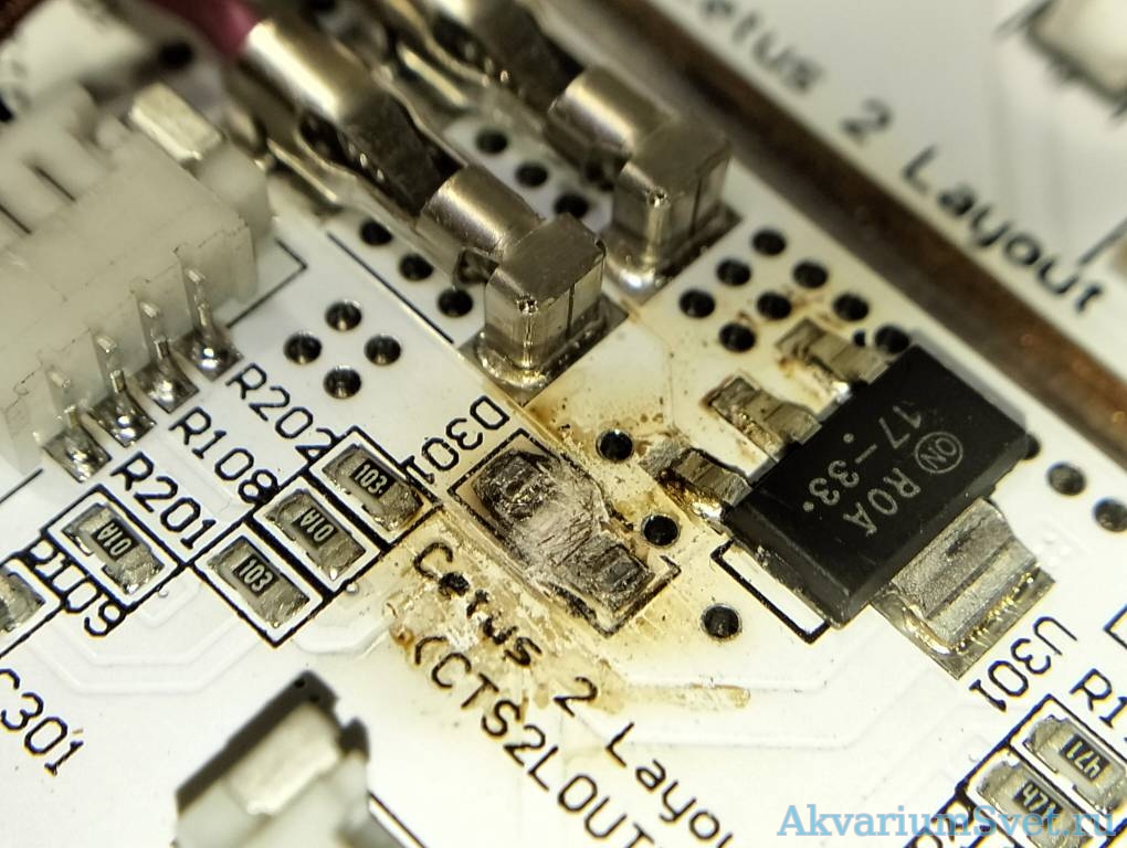 | Был скачок напряжения — сгорел блок питания и (как минимум) три детали на плате светильника. Светильник привезли на ремонт в разобранном виде. ![]() Результаты предварительной диагностики я отметил красными стрелками. ![]() Деталь под номером D301 выгорела во время скачка напряжения. Скорее всего это входной защитный диод. Номинал диода неизвестен, так как он отсутствует на плате. Клиент предположил, что если вместо него впаять новый диод, то светильник снова будет работать. Но к сожалению сгорел не только он, но и стоя́щая рядом микросхема стабилизатора напряжения. ![]() Вот эта микросхема. Прозвонка мультиметром показала замыкание на всех её выводах. ![]() Также подозрительно выглядела и вот эта неопознанная деталь. Слева на детали видно подгоревшее пятно. ![]() Возможно, что это датчик контроля температуры, так как установлена эта деталь вблизи светодиодной сборки. ![]() Участок платы со светодиодами. ![]() Это уже новый блок питания, а старый во время скачка напряжения вышел из строя и успел пропустить на вход светильника напряжение выше нормы. Из-за перенапряжения сгорела микросхема и своим замыканием спалила входной защитный диод. ![]() Радиатор и вентилятор светильника Cetus 2. ![]() Накладка с линзами (лицевая часть). ![]() Накладка с линзами (изнанка). Сгоревшие детали оставили следы на пластике. ![]() Я не стал подбирать наугад сгоревшие детали и ремонтировать светильник. Да и нет никакой гарантии, что микросхема контроллера светильника осталась целой. А вот драйверы и светодиоды скорее всего выжили. Возможно данная информация пригодится мастерам, которые столкнутся с такой же поломкой данного светильника. |