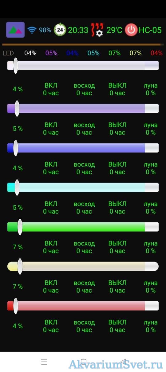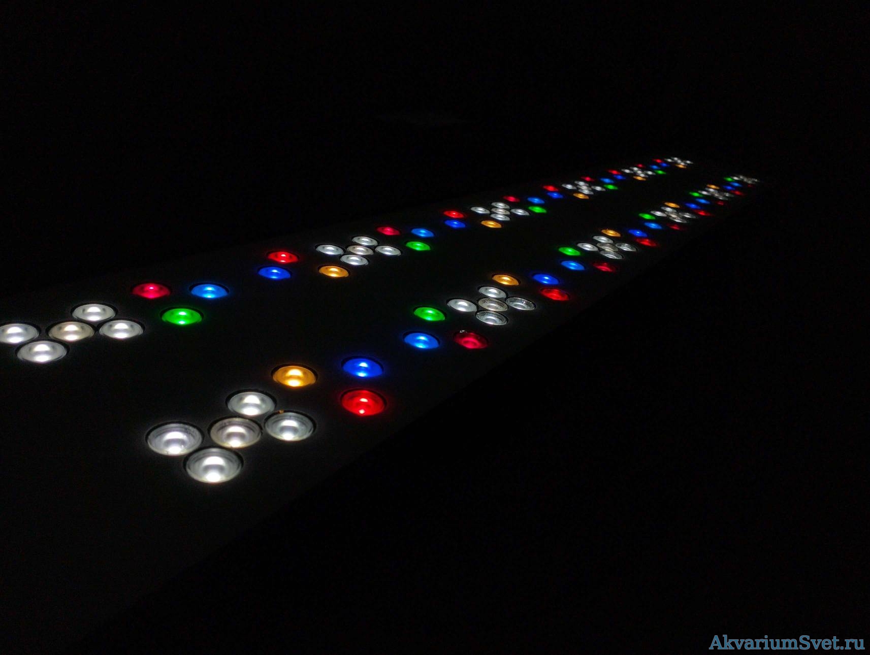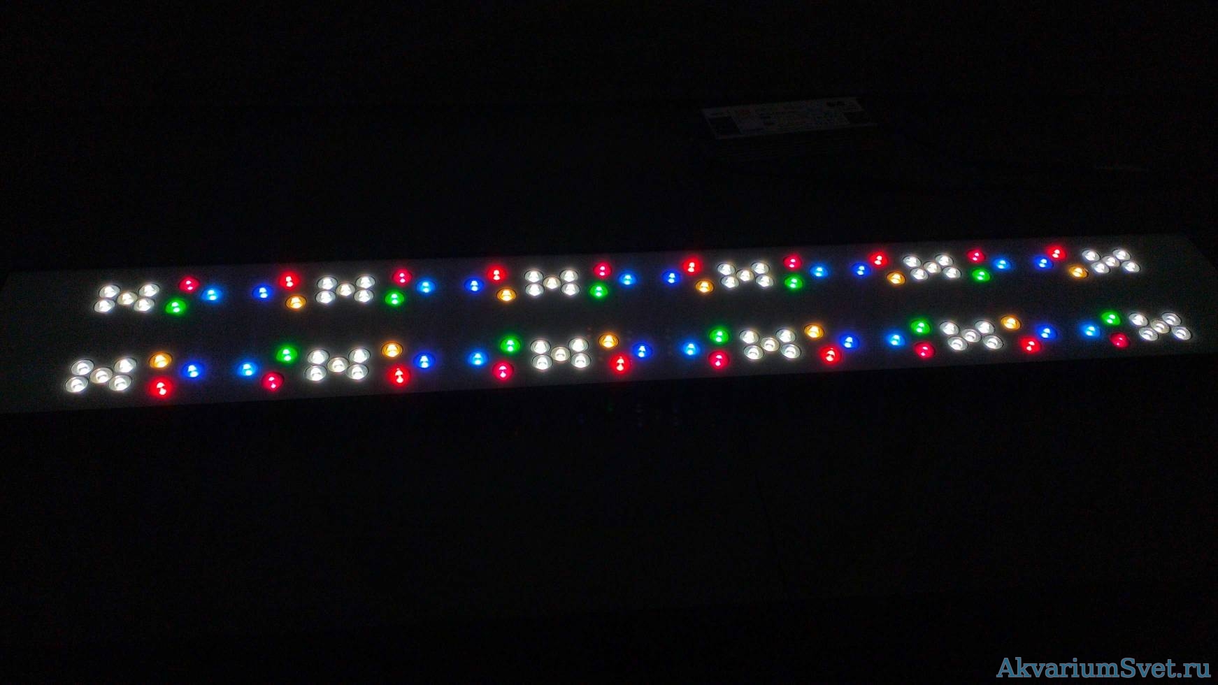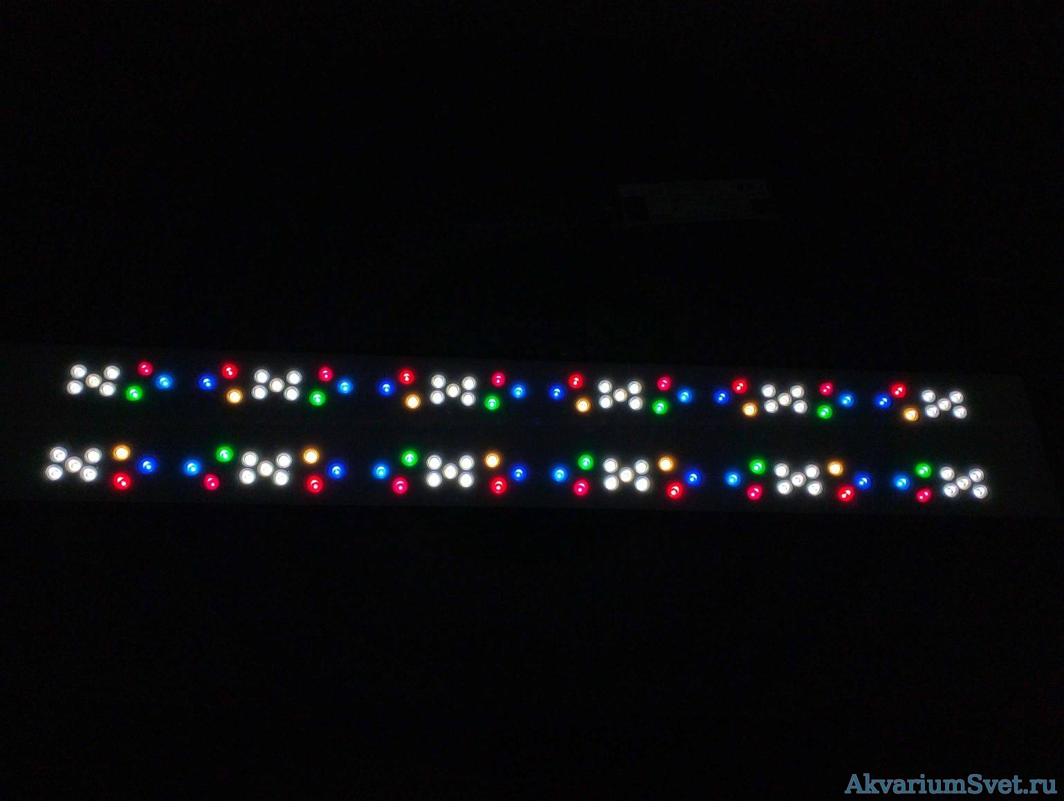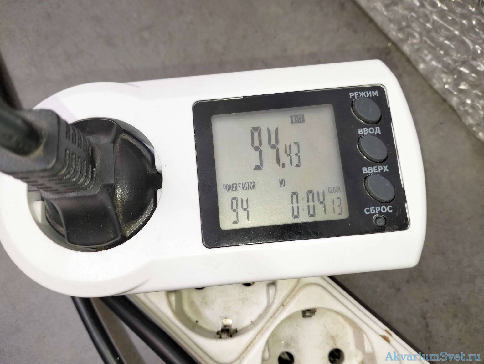 | Фотографий в этот раз будет немного, так как этот светильник внешне не отличается от предыдущих светильников из этого профиля. Изменилась только мощность на эту длину, немного другое расположение светодиодов и добавлен отдельный канал с голубыми светодиодами. На фото — аквариумный светильник 120 см., 94 ватта, 9300 люмен. ![]() Фотография светильника в темноте на небольшой яркости. ![]() Потребляемую мощность замерял вот таким ваттметром. ![]() 6 каналов управления: 1) 6500K+8000K